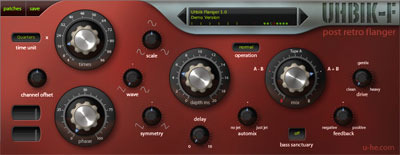 Uhbik-F simulates two tape machines per audio channel, with recording and playback heads that can even occupy the same position if you want – impossible in the real world! Bass frequencies can bypass the effect ('bass sanctuary') to ensure LF-stability while the rest of the sound is swept around. Turn up the drive (2nd harmonic distortion), and your lead line will scorch its way through any mix!