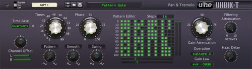 Our tremolo unit Uhbik-T is a general-purpose 'rhythmicizer' featuring linear or exponential (with 3 different strengths) gain modulation. But there's much more: You can morph between user-defined patterns in the 11 x 16 grid, apply rhythmic lowpass filtering, add vibrato or Haas-delay spatial effects. In either of the pattern modes, the LFO wave knob selects a position between 11 user-defined patterns, and the LFO scale knob determines precisely how 'choppy' the effect is... tremolo redefined!