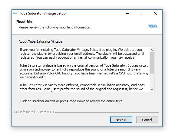 Tube Saturator Vintage is a free reissue of the original Tube Saturator. It uses circuit simulation technology to faithfully reproduce the sound of a dual triode preamp. While it sounds great, the circuit simulation technology is very CPU intensive, that’s why we developed its successor, Tube Saturator 2. Tube Saturator 2 is vastly more efficient, nearly identical in simulation accuracy, and adds other features. However, some users prefer the sound of the original and request it, hence we have released it as a free plug.