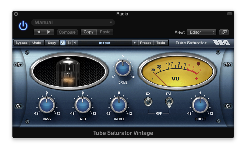 Use Tube Saturator to add a bit of analog warmth to recordings, or increase the drive for some distortion. You can use it as a saturating peak limiter too.